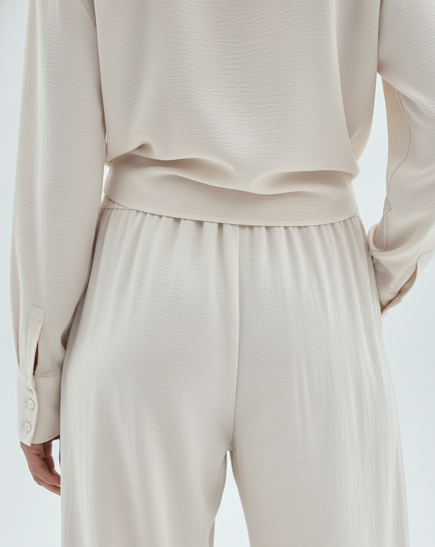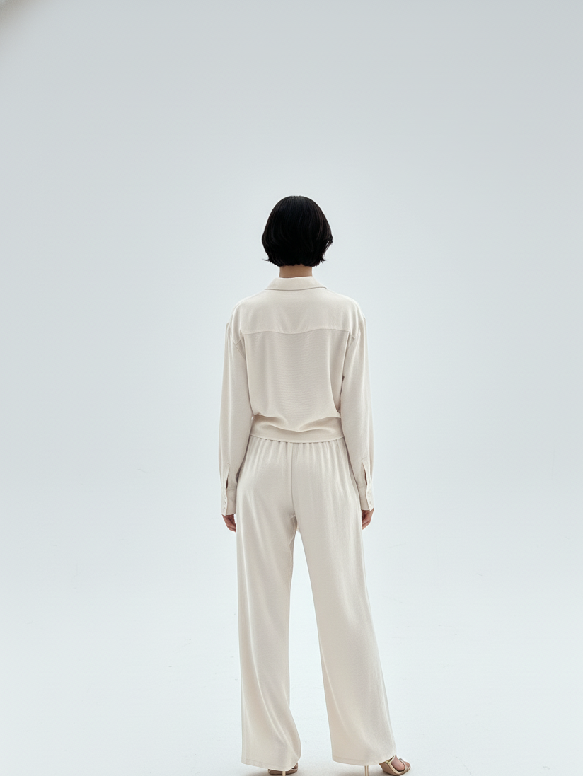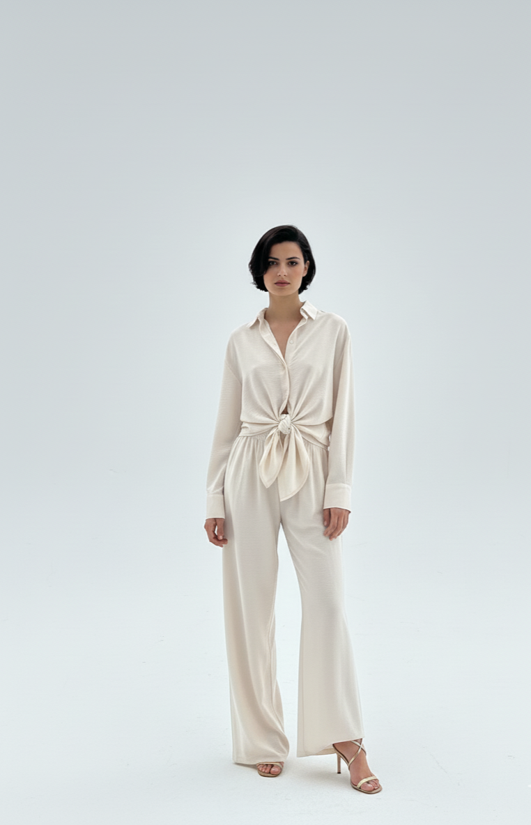 La coupe est longue, touchant presque le sol, contribuant à allonger la silhouette.