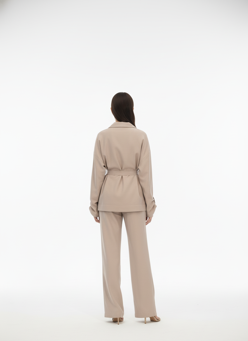 Matière : Tissu fluide et léger, possiblement coton mélangé ou lin pour le manteau et le pantalon. Détails :