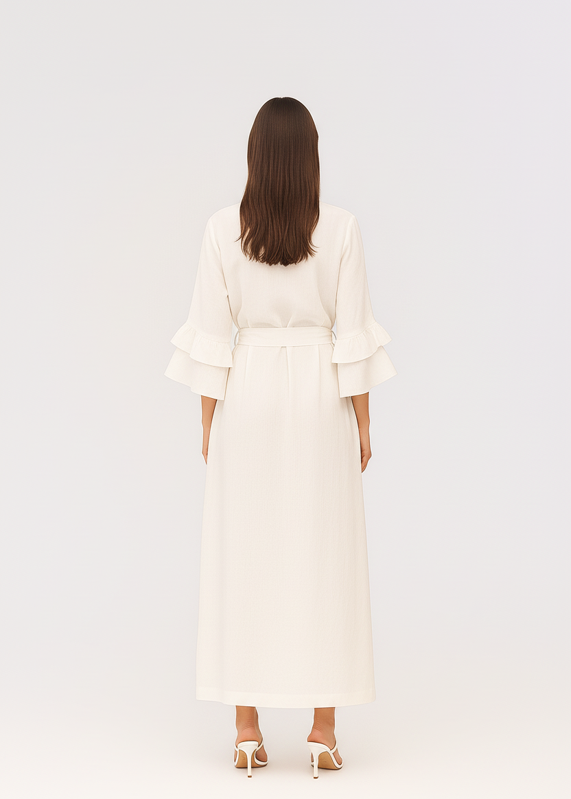 Ceinture assortie, large, nouée à la taille pour structurer la silhouette.