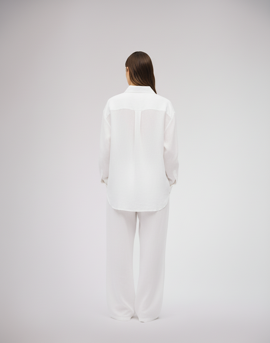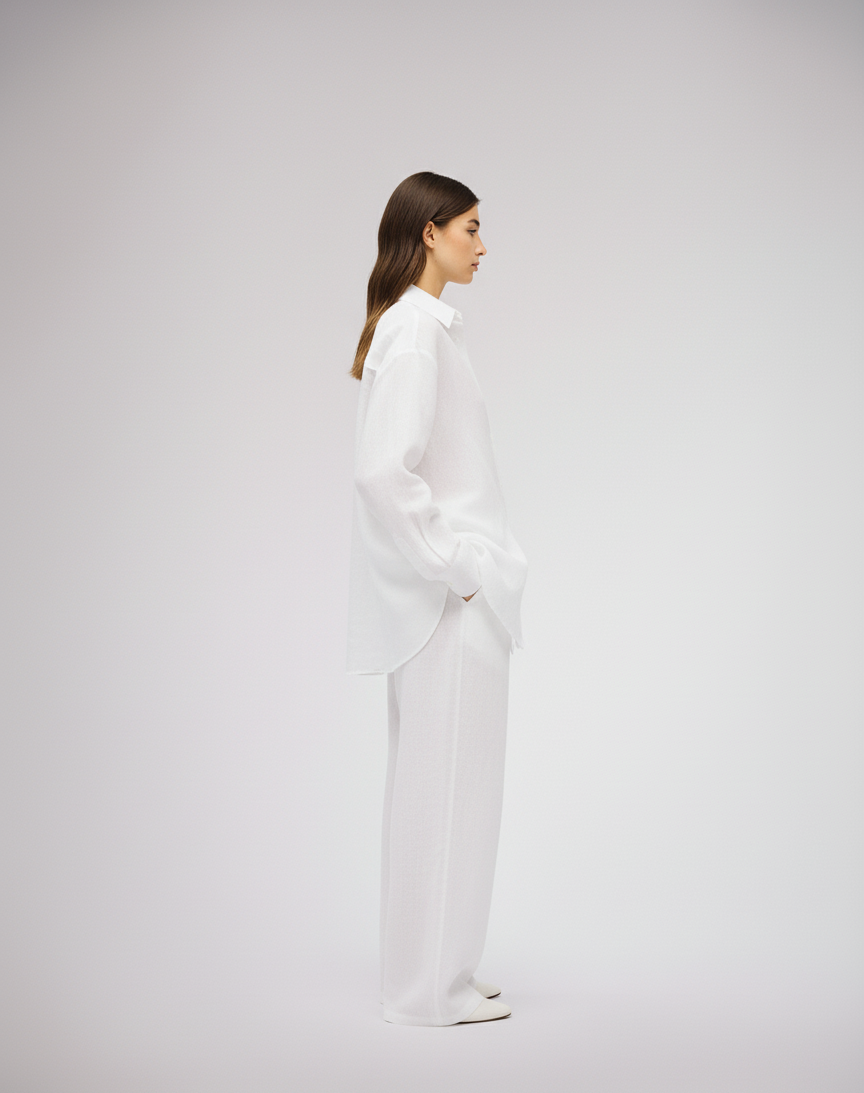 Matière : Tissu naturel et texturé (type lin, coton épais ou une toile légère). La matière semble avoir une belle tenue et être respirante.