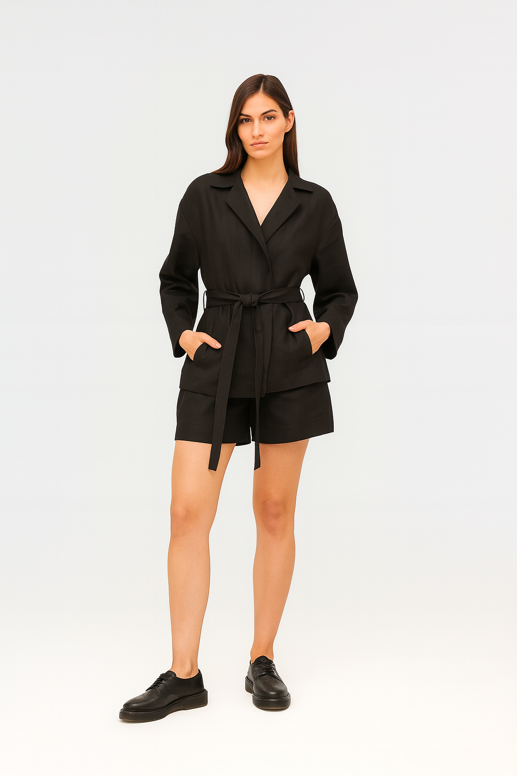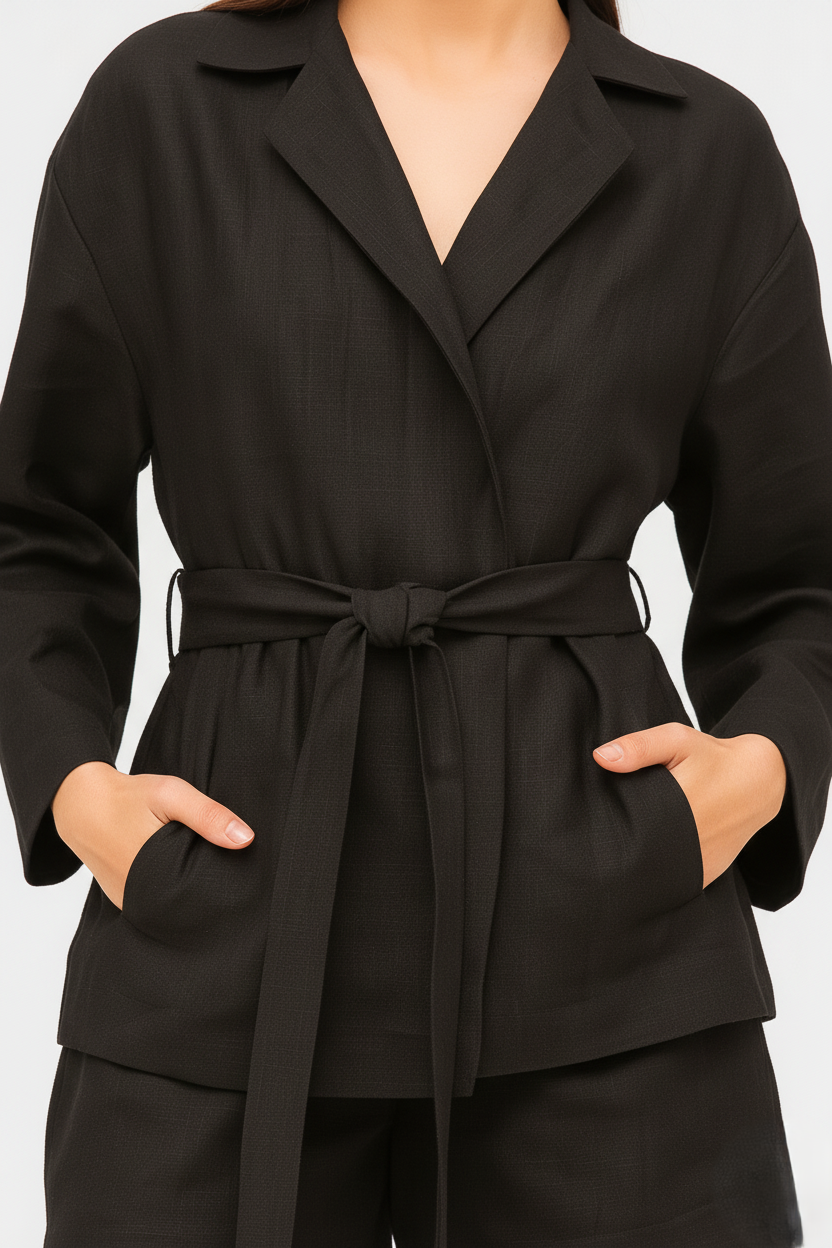 cette veste joue la carte du style et de la liberté : fermeture croisée avec ceinture amovible, col structuré, poches passepoilées et manches ajustables pour un look chic, pratique et résolument moderne.