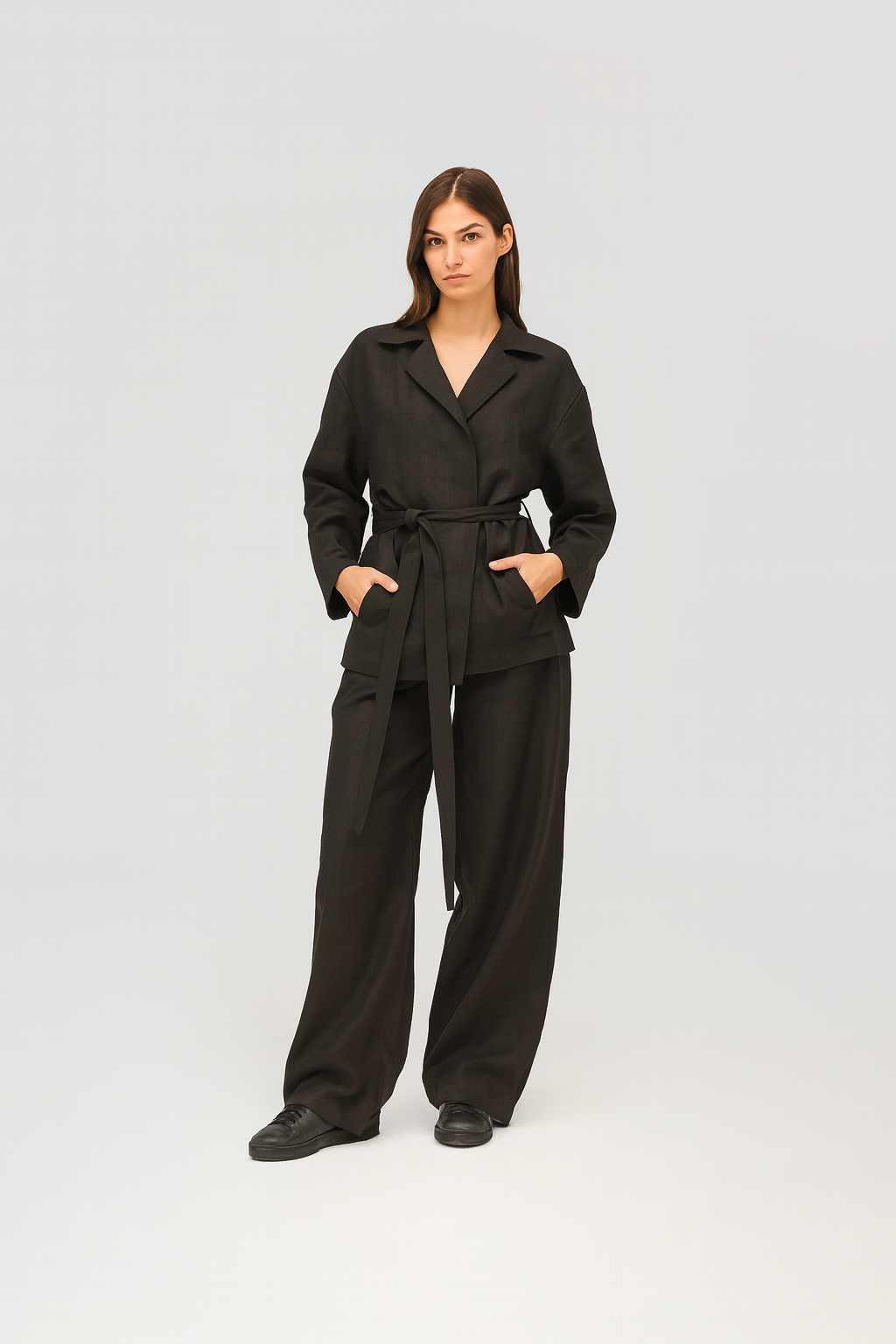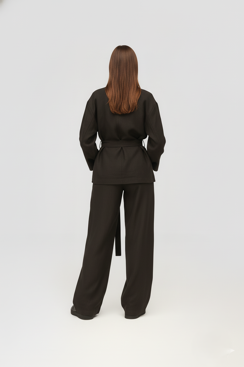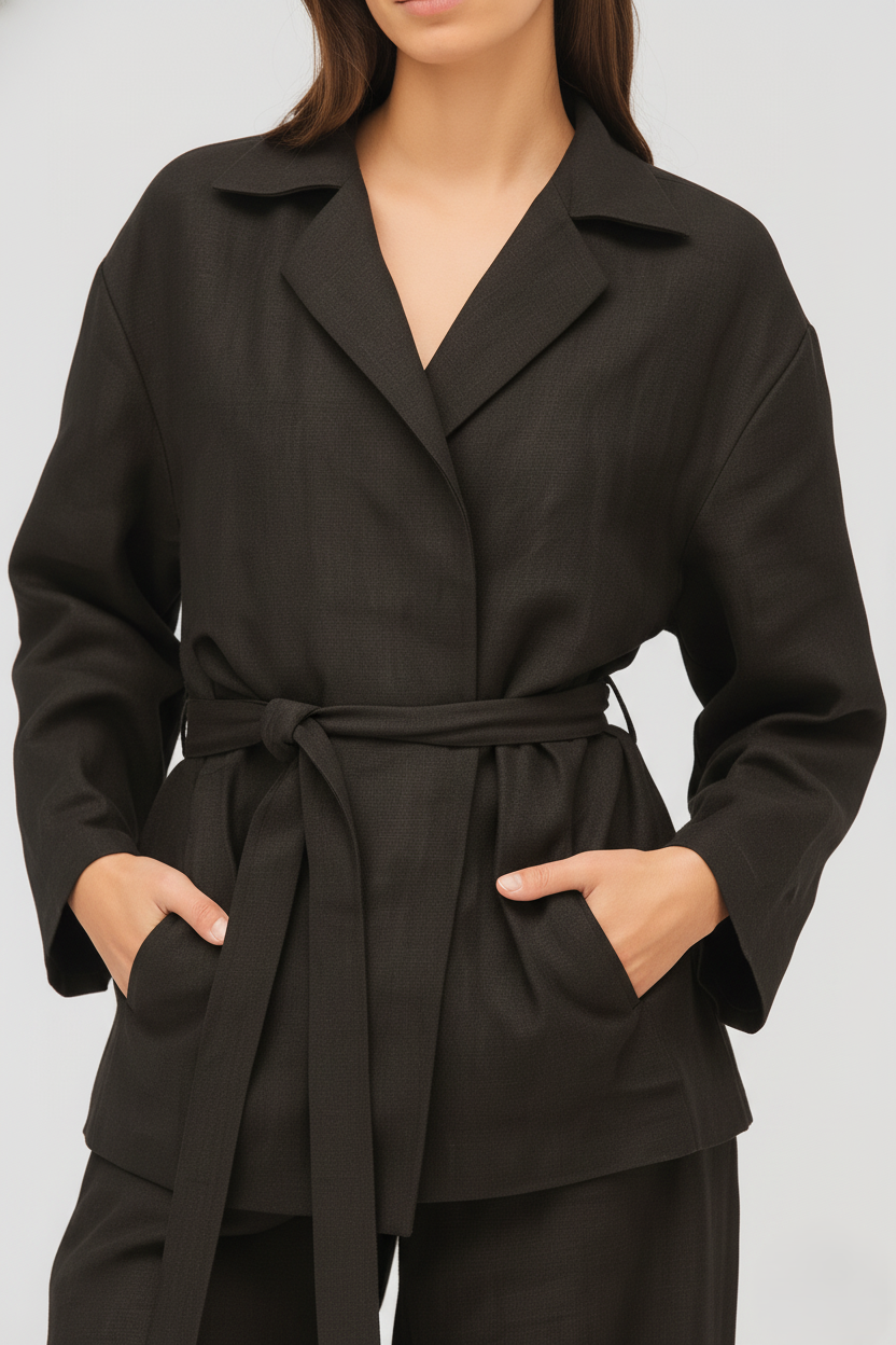 cette veste joue la carte du style et de la liberté : fermeture croisée avec ceinture amovible, col structuré, poches passepoilées et manches ajustables pour un look chic, pratique et résolument moderne.