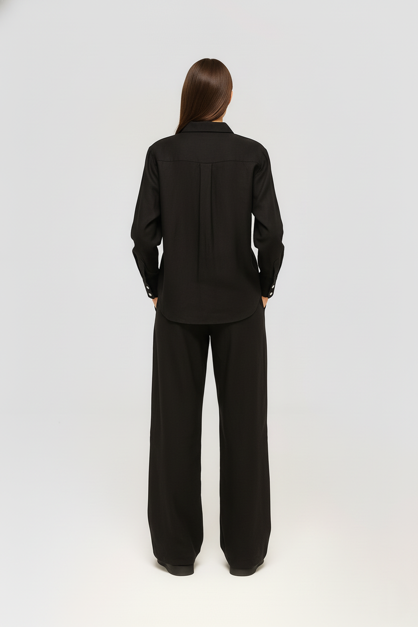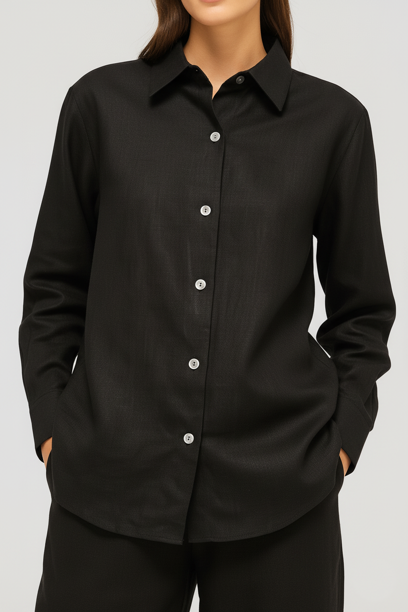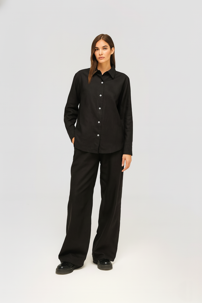 Chaque détail compte : des épaules légèrement tombantes pour un confort naturel, un col pied-de-col classique et raffiné, et deux plis plats au dos qui offrent liberté de mouvement et fluidité. Même dans sa simplicité, cette chemise allie praticité et style intemporel.